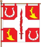 а квадратному червоному полотнищі білий хрест із білим круглим розширенням на перетині рамен, на вертикальному рамені червоний вертикальний полум'яний меч. На верхній древковій і нижній вільній частинах білі підкови вушками догори, на верхній вільній і нижній древковій частинах жовті лепехи. Ширина рамен дорівнює 1/4 від ширини прапора.