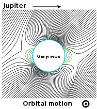 Взаємодія між магнітосферою Ганімеда та плазмою Юпітера багато в чому нагадує взаємодію між сонячним вітром і земною магнітосферою[66][68]. Плазма обертається разом із Юпітером і зіштовхується з магнітосферою Ганімеда на його веденій стороні, як і сонячний вітер із земною магнітосферою. Основна відмінність — швидкість плазмового потоку: надзвукова у випадку Землі та дозвукова у випадку Ганімеда. Саме тому в магнітного поля Ганімеда немає ударної хвилі з запізнювального боку[68].