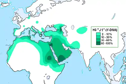 Поширення J1 за межами Близького Сходу може бути пов'язано з неолітичними пересуваннями народів (J1 *) і пізніше міграціями семітомовного населення Близького Сходу в Іспанію, Пакистан та інші регіони.