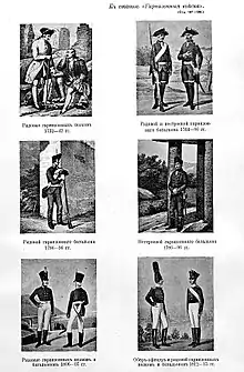 У 1764 році гарнізонні піхотні полиці були розділені на окремі батальйони (військова частина)[4], а кавалерія вилучена з їхнього складу. Вийшло 84 одиниці. Гарнізонні драгунські полки - звернені до польових військ .