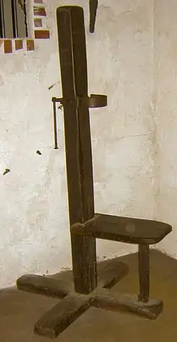 Пізніше засудженого стали саджати на вузьку лавку, прикріплену до стовпа, а кат став використовувати палицю, протягнуту крізь мотузок. Крутивши її, він затягував петлю, що здавлювала шию засудженого. Ця форма душіння розвинулася в залізний нашийник, що складався із смуги, протягнутої у вушка, закріплені на стовпі і фіксованою на могутньому болті, встановленому позаду стовпа. При закручуванні гвинт тягнув назад кінці нашийника, затягуючи його і поволі душив засудженого. Ця форма страти була боліснішою і тривалішою (до 10 хвилин), аніж повішення.
