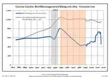 Динаміка населення з 1875 року в сучасних кордонах (Синя лінія: населення; Пунктир: відносна порівняльна динаміка населення землі Бранденбург; Сірий фон: період Третього рейху; Помаранчевий фон: період НДР)