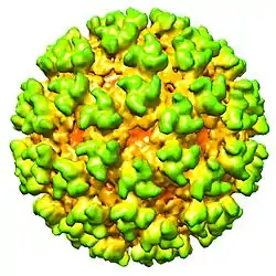 ![]() Кріоелектронна реконструкція вірусу — збудника гарячки лісу Семлікі Кріоелектронна реконструкція вірусу — збудника гарячки лісу Семлікі | |