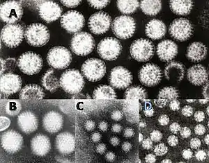 ![]() Віруси, що здатні спричинити гастроентерит: A = ротавірус, B = аденовірус, C = норовірус та D = астровірус. Вірусні частки однакового збільшення, щоб можна було порівняти їхній розмір. Віруси, що здатні спричинити гастроентерит: A = ротавірус, B = аденовірус, C = норовірус та D = астровірус. Вірусні частки однакового збільшення, щоб можна було порівняти їхній розмір. | |
