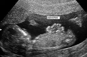 ![]() УЗД картина гастрошизіса, продемонсторвано в сагітальній площині УЗД картина гастрошизіса, продемонсторвано в сагітальній площині | |