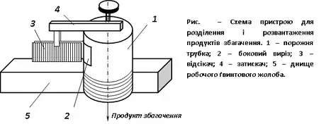 Пристрій для розділення і розвантаження продуктів збагачення (рис.) складається з порожньої трубки 1 з боковим вирізом 2 і відсікача 3, що фіксується затискачем 4. Трубка угвинчується в отвір в днищі жолоба 5.