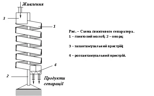Ґвинтовий сепаратор складається із завантажувального пристрою, ґвинтового жолоба, розподільника змивної води, пристрою для розділення і розвантаження продуктів збагачення, опорного каркаса.