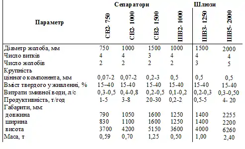 Технічні характеристики ґвинтових сепараторів і шлюзів