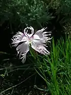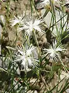 Квітконосні пагони численні, при основі циліндричні, вище кутасті, голі. Квітки завширшки 1,5—3 см, розташовані поодиноко на кінцях квітконосних стебел, білі чи блідо-рожеві, зрідка з червоним центром, в зіві сильно борідчасто-волосисті. Їм притаманний специфічний приємний запах, характерний для усіх гвоздик. Чашечка завдовжки 2,5 см, видовжена, вузька, в пуп'янках і на початку цвітіння зелена, пізніше з пурпуровим відтінком. Зубці чашечки загострені, розставлено-війчасті. Приквіткових лусок 2—4 штуки, причому довжина внутрішніх лусок не перевищує 1/5 довжини чашечки. Формою вони від яйцеподібно-еліптичних до оберненояйцеподібних, загострені або гострі, голі, з плівчастими краями. Пелюсток п'ять, їхня довжина складає близько 1,5 см, вони майже округлі, по краях глибоко розсічені на тонкі частки, що спрямовані трохи вниз.
