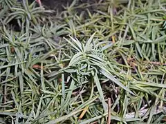 Багаторічна трав'яниста рослина заввишки 15—30 см, окремі особини якої утворюють подушки, а численні — своєрідний килим. Вегетативні органи яскраво-зелені із малопомітним сизуватим напиленням. Стебла численні, висхідні або прямостоячі, тонкі, густо улиснені, причому листки скупчені переважно в їхній нижній частині. Листкорозміщення супротивне. Листки ланцетні, із загостреними жорсткими кінчиками. Нижні листки завдовжки близько 2,5 см, завширшки 0,1-0,2 см, спрямовані вбік або вгору, по краях тонкозубчасті, трижилкові. Верхні листки більші (завдовжки до 5 см), мають піхви завдовжки 0,2 см, спрямовані вгору під гострим кутом, цілокраї.