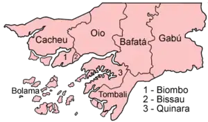 В адміністративно-територіальному відношенні територія держави поділяється на: 9 регіонів (8 континентальних + 1 округ Болама на архіпелазі Біжаґош), що входять до складу 3 провінцій за стандартом ISO 3166-2:GW. Столиця країни виділена в самостійний округ Бісау, найменший за площею, але найбільший за населенням. Острівний округ Болама заселений найменш усього.