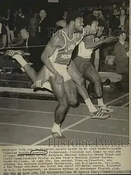 ![]() Гейзлі Кроуфорд (на передньому плані) фінішує в забігу на 60 ярдів на чемпіонаті США в приміщенні (1975) | ||||||||||||||||||||||||||