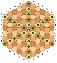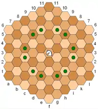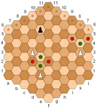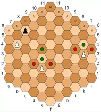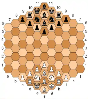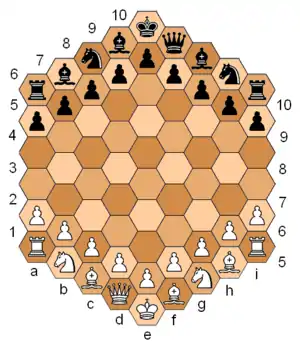 Гра ведеться двома гравцями на шестикутній дошці, що має 91 поле трьох кольорів (зазвичай один з кольорів білий). Дошка має 11 вертикалей, що позначаються літерами a, b, c, ..., k, l (літера j не використовується). Поля кожної нумеруються знизу вгору. На крайніх вертикалях по 6 полів, на центральній — 11. Роль горизонталей виконують діагоналі, зліва від лінії «f» — паралельні а1-f1, а справа — паралельні f1-l1. До класичного набору фігур додано ще одного слона та пішака. Початкова позиція показана на діаграмі справа.