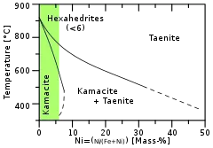 ![]() Фазова діаграма нікелистого заліза, що показує залежність структури від вмісту нікелю та температури. Гексаедрити містять переважно камасит, оскільки їхній хімічний склад уможливлює існування лише камаситу як стабільної фази. | |