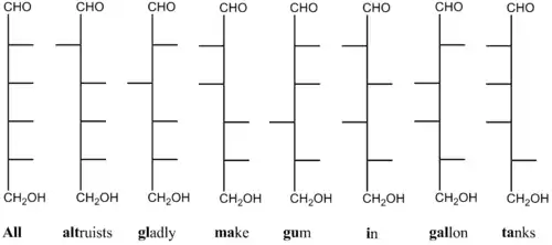 Зображуємо 8 проєкцій Фішера альдогексоз в такий спосіб. Для скорочення позначатимемо гідроксильну групу рискою, атом гідрогену — відсутністю риски. Гідроксильні групи при C-5 (другий знизу атом в традиційному зображенні) спрямовані вправо для D-вуглеводів. При C-4 малюємо 4 вправо і потім 4 вліво. При C-3 по черзі 2 вправо, 2 вліво. При C-2 по черзі 1 вправо, 1 вліво. Тепер побудованим проєкціям зіставляємо назви за допомогою жартівливої фрази англ. All altruists gladly make gum in gallon tanks: алоза, альтроза, глюкоза, маноза, гулоза, ідоза, галактоза, талоза.