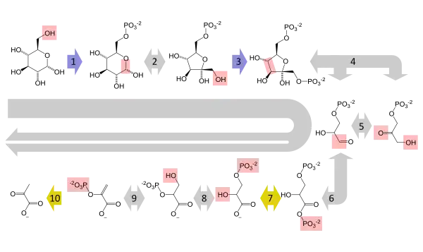 - D-гексоза + АТФ → D-гексозо-6-фосфат + АДФ.