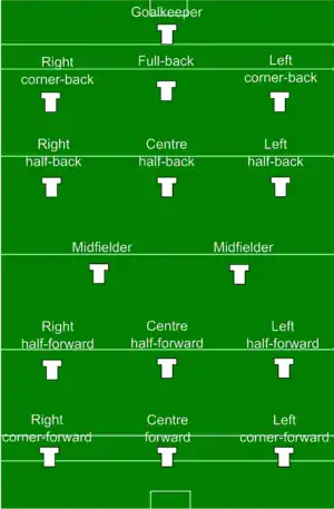 | 12 | Лівий півнападник | Left half forward | Left wing forward | Leatosaí clé |