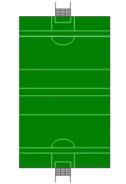 На двох кінцях поля розташовані H-подібні ворота висотою 6 м. Ворота влаштовано з двох стовпів, розташованих на відстані 6,4 м один від одного. На висоті 2,44 м стовпи з'єднані поперечиною. За воротами встановлено ще два стовпи, висота яких дещо менша. Сітка воріт прилаштована до поперечини та задніх стовпів.