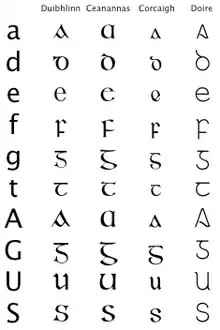 Окрім 26 літер латинської абетки гельський шрифт повинен містити всі голосні з гострим наголосом (Áá Éé Íí Óó Úú), набір приголосних із крапкою зверху (Ḃḃ Ċċ Ḋḋ Ḟḟ Ġġ Ṁṁ Ṗṗ Ṡṡ Ṫṫ), а також тиронський знак et «⁊», який в ірландській уживають замість сполучника agus. Гельські шрифти також часто містять острівні форми літер s та r, а деякі — також лігатури, які вживали у ранніх гельських рукописних текстах. Малу букву i пишуть без крапки (хоча вона не є відповідником турецької ı), а літери d, f, g та t мають острівні форми. Багато сучасних гельських шрифтів містять форми літер j, k, q, v, w, x, y та z, а також підтримують голосні, які вживають у інших кельтських мовах. Вони також розрізняють знаки & та ⁊ (як це є у традиційній типографії), хоча деякі сучасні шрифти помилково заміняють амперсанд тиронським знаком, оскільки обидва означають і (сполучник).