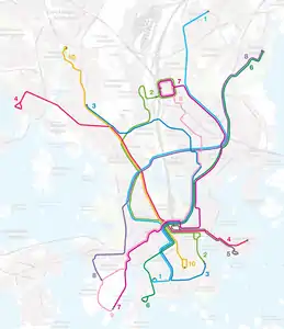 | 2[B] | Олімпія термінал | Ласіпалатсі, Tьоьольо | Західна-Пасіла | 06:00–01:30 | Коскела | |