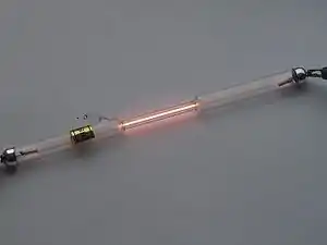 При проходженні струму через заповнену гелієм трубку спостерігаються розряди різних кольорів, що залежать головним чином від тиску газу в трубці. Зазвичай видиме світло спектра гелію має жовте забарвлення. У міру зменшення тиску відбувається зміна кольорів на рожевий, помаранчевий, жовтий, яскраво-жовтий, жовто-зелений і зелений. Це пов'язано з присутністю в спектрі гелію декількох серій ліній, розташованих в діапазоні між інфрачервоною і ультрафіолетовою частинами спектра. Найважливіші лінії гелію у видимій частині спектра лежать між 706,52 нм і 447,14 нм[10]. Зменшення тиску призводить до збільшення довжини вільного пробігу електрона, тобто до зростання його енергії при зіткненні з атомами гелію. Це призводить до переходу атомів в збуджений стан з більшою енергією, в результаті чого і відбувається зміщення спектральних ліній від червоного до фіолетового краю видимого спектра.