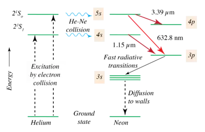 Механізм, що забезпечує інверсну заселеність та підсилення світла в плазмі HeNe лазера[8] опирається на непружні зіткнення енергетичних електронів з атомами гелію в основному стані. Як показано на діаграмі рівнів, ці зіткнення переводять атоми гелію з основного стану в збуджені метастабільні стани з великим часом життя: 23S1 та 21S0 (число 2 попереду позначення елемента показує, що його електрон перебуває в стані з квантовим числом n = 2). Завдяки вдалому збігові між енергетичними рівнями двох метастабільних станів гелію та 5s2 і 4s2 (нотація Пашена[9]) рівнями атома неону, зіткнення між цими метастабільними атомами гелію та атомами неону в основному стані призводить до селективної й ефективної передачі енергії збудження від гелію до неону. Цей процес передачі енергії збудження задається рівняннями реакції: