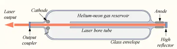 Активне середовище лазера є сумішшю гелію та неону в газовому стані у співвідношенні приблизно 10:1 у скляній посудині з низьким тиском. В основному суміш містить гелій, і збуджуються в першу чергу саме атоми гелію. Збуджені атоми гелію стикаються з атомами неону й передають збудження частині з них, змушуючи їх випромінювати світло з довжиною хвилі 632,8 нм. Без гелію атоми неону збуджувалися б здебільшого в стани з низькою енергією, що відповідають лініям, які не годяться для лазера. Неоновий лазер без гелію сконструювати можна, але без такого шляху передачі енергії це набагато складніше. Тому HeNe лазер, що втратив гелій (наприклад, через дифузію крізь спайку в склі), утратить функціональність як лазер, тому що ефективність накачування стане надто малою[5]. Енергію або накачування лазер отримує від високовольтного газового розряду, що проходить через газ між поміщеними в трубку електродами (анодом та катодом). Для функціонування лазера потрібен постійний струм, типово від 3 до 20 мА . Резонатор лазера зазвичай складається з двох увігнутих дзеркал, або одного плоского й одного увігнутого, що мають дуже високий (типово 99.9%) коефіцієнт відбиття. Вихідне дзеркало дозволяє приблизно 1% пропускання світла.