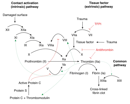 Нормальний фізіологічний процес (зовнішня система або екзогенний механізм) ініціюється контактом крові з тканинним тромбопластином з травмованої субендотеліальної тканини. Тканинний фактор ((ТФ), тканинний тромбопластин або фактор III) — мембранний білок, який утворюється, в адвентиції судин, та вивільняється лише ендотеліальними клітинами після активації. Він утворює комплекс з фактором VII, який перетворює його в активну форму. Внаслідок цього механізму утворюється тромбін, але процес пригнічується достатньо швидко «інгібітором шляху тканинного фактора» (ІШТФ). Коли утворюється достатня кількість тромбіну, активується так званий активаторний комплекс факторів IX та VIII. Цей комплекс у свою чергу активує фактор X.