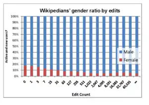 - серед осіб, які зробили більше ніж 500 редагувань, жінками були лише 6 %, чоловіків було удвічі більше (дослідження Фонду Вікімедіа, 2009)[21];