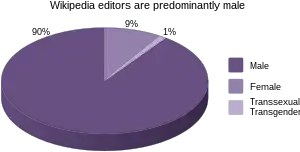 Хоча близько 47 % читацької аудиторії — жінки, серед людей, що редагують її, жінок лише близько 10 % (8,5 % — 16,1 % за даними опитувань та досліджень 2015[16], 2011[12][17], 2013[18], 2016). Вікіпедія не досягає успіху у перетворенні читачок на редакторок.