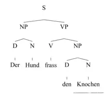 Синтаксичне дерево може бути представлене також у вигляді системи квадратних дужок: [S [NP [D Der ] [N Hund ] ] [VP [V fraß ] [NP [D den ] [N Knochen ] ] ] ]