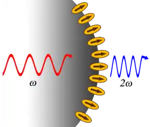 де — тензор нелінійної спийнятливості, характеристика матеріалів, що межують між собою[5]. Показано, що генерована та відповідна їй дозволяють отримати інформацію про орієнтацію молекул на поверхні розділу, аналітику хімії поверхні та поверхневі хімічні реакції.