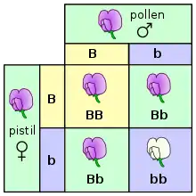 Тут співвідношення між генотипом і фенотипом проілюстровано за допомогою квадрата Пеннета для характеристики кольору пелюсток у гороху. Літери B і b представляють гени кольору, малюнки показують вислідні квіти.