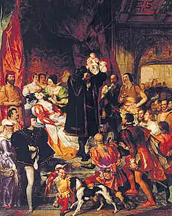 Не встигли відлунати весільні привітання, як двір був вражений звісткою про замах на адмірала Коліньї, одного з вождів протестантів, а слідом за цим почалася розправа над протестантами Парижа. Через шість днів після весілля католики підступно напали на гугенотів, які довірливо з'їхалися в Париж на весільні урочистості, і вчинили їм у ніч святого Варфоломія жорстоку бійню. Вся свита Генріха, що розташовувалася в Луврі, була перебита, але сам він, давши обіцянку перейти в католицтво, уникнув загальної долі. Наступні чотири роки Генріх прожив у Парижі на положенні бранця. Відмову від протестантизму і повернення в лоно католицтва Генріха використали для утихомирення вогнища опору — Ла-Рошелі. Його змусили підписати указ про відновлення католицизму і заборону протестантського культу в Беарні. Але прозелітизм міг бути й тактичним ходом Генріха Наваррського. У роки вимушеного полону при дворі Карла IX і Генріха III майбутній король Франції навчився політичній грі, якою майстерно володіло його оточення. Його ніколи не залишала думка про повернення в Беарн.