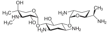 | (3R,4R,5R)-2-{[(1S,2S,3R,4S,6R)-4,6- diamino-3-{[(2R,3R,6S)- 3-amino-6-[(1R)- 1-(methylamino)ethyl]oxan-2-yl]oxy}- 2-hydroxycyclohexyl]oxy}-5-methyl- 4-(methylamino)oxane-3,5-diol | |