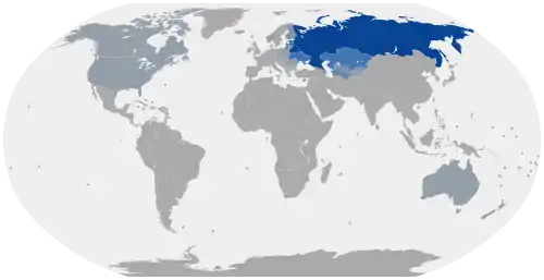 У 20 столітті російська мова була обов'язковою мовою, яка викладається в школах членів старого Варшавського договору та в інших країнах, які колись були сателітами СРСР. Зокрема, ці країни включають Польщу, Болгарію, Чехію, Словаччину, Угорщину, Албанію, колишню Східну Німеччину та Кубу. Проте молоді покоління, як правило, не володіють нею, тому що російська мова більше не є обов'язковою у шкільній системі. Згідно з дослідженням «Євробарометр-2005»[67] однак, у деяких країнах, зокрема, у тих, де люди говорять слов'янською мовою, вони володіють достатньо високим рівнем (20-40 %), а також володіють перевагами вивчення російської мови (зокрема, Польща, Чехія, Словаччина та Болгарія).