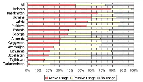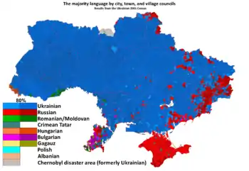 За Конституцією України 1996 року, російська мова розглядається як мова міжетнічного спілкування та мова меншин .[17] За даними Demoskop Weekly, 2004 року в країні було 14 400 000 носіїв російської мови та 29 млн активних мовців.[18] 65 % населення вільно володіють російською мовою 2006 року, а 38 % — як основною мовою в сім'ї, з друзями або на роботі.[19]