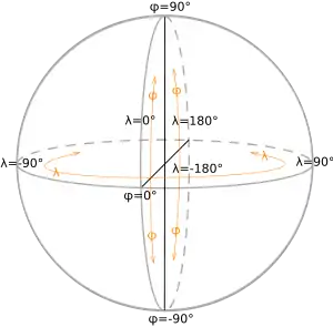 «Довгота» (скорочення: д., λ, або lambda) точки на поверхні Землі — це кут на схід або захід від Гринвіцького (нульового) меридіана до іншого меридіану, який проходить через цю точку. Всі меридіани є половинами великих еліпсів (часто називаються великими колами), які сходяться на Північному і Південному полюсах. Меридіан Британської Королівської обсерваторії в Гринвічі, на південному сході Лондона, Англія, є міжнародним меридіаном, хоча деякі організації, наприклад, Національний Географічний інститут Франції, продовжують використовувати інші меридіани для внутрішніх цілей. Нульовий меридіан розділяє власне Східну і Західну півкулі, хоча карти часто зміщують півкулі на захід, щоб розташувати Старий Світ з одного боку. Міжнародна лінія зміни дат є як 180° західної, так і 180° східної довгот. Проте вона не однакова з Міжнародною лінією зміни дат, яка відхиляється від неї в кількох місцях з політичних причин, у тому числі між далекосхідною Росією і далекими західними Алеутськими островами.
