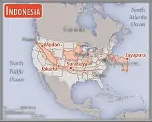 Індонезія — південносхідноазійська країна, що межує з трьома іншими країнами: на острові Тимор зі Східним Тимором (спільний кордон — 253 км), на острові Калімантан — з Малайзією (1881 км), на острові Нова Гвінея — з Папуа Новою Гвінеєю (824 км). Загальна довжина державного кордону — 2958 км[1]. Крайні західну і східну точки країни розділяють приблизно 5150 км, а крайній північну і південну — 1800 км. Індонезія на півночі омивається водами морів Тихого, на півдні — Індійського океанів[4]. Індонезія Малаккською протокою відділена від Західної Малайзії і Сингапуру, морями Сулу і Сулавесі від Філіппін, Тиморським і Арафурським морями від Австралії[4]. Загальна довжина морського узбережжя 54,7 тис. км[1].