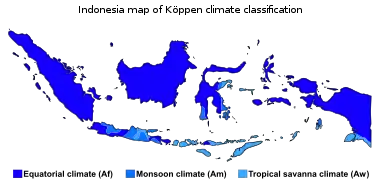 Територія Індонезії лежить у екваторіальному кліматичному поясі, окрім південного ланцюгу найбільш населених островів (Ява, Сумба, Сумбава, Флорес, Тимор), які лежать у субекваторіальному[8]. Цілий рік панують екваторіальні повітряні маси[9]. Цілий рік спекотно, сезонні коливання температури незначні, значно менші за добові[9]. превалюють слабкі вітри, цілий рік надмірне зволоження, майже щодня по обіді йдуть дощі, часто зливи з грозами[9]. На півдні влітку переважають екваторіальні повітряні маси, взимку — тропічні. Влітку вітри дмуть від, а взимку до екватора. Сезонні амплітуди температури повітря незначні, зимовий період не набагато прохолодніший за літній[9]. Зволоження достатнє, у літньо-осінній період з морів та океанів часто надходять руйнівні тропічні циклони[9].