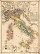 Надра Італії багаті на ряд корисних копалин: кам'яне вугілля, ртуть, цинк, калійні солі, мармур, барит, азбест, пемзу, флюорит, польовий шпат, пірит, природний газ, нафту[8].