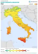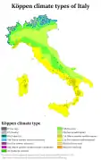 Більша частина території Італії лежить у субтропічному кліматичному поясі, північ — у помірному, перехідного від морського до континентального типу[9]. Влітку переважають тропічні повітряні маси з ясною тихою антициклонічною погодою, взимку — помірні з похмурою дощовою досить вітряною циклонічною[10]. Значні сезонні амплітуди температури повітря і розподілу атмосферних опадів, можливе випадіння снігу[10]. На півночі опадів значно більше, але їхній розподіл нестійкий.