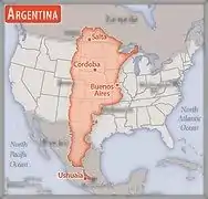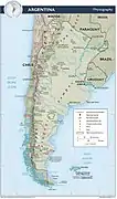 Аргентина — південноамериканська країна, що межує з п'ятьма іншими країнами: на півночі — з Болівією (спільний кордон — 942 км), на північному сході — з Парагваєм (2531 км), на сході — з Бразилією (1263 км) і Уругваєм (541 км), на заході — з Чилі (6691 км). Загальна довжина державного кордону — 11 968 км[1]. Країна займає фактично всю південно-східну частину Південної Америки. Протяжність Аргентини з півночі на південь становить близько 3800 км і близько 1400 км із заходу на схід. Аргентина на сході омивається водами Атлантичного океану[4]. Загальна довжина морського узбережжя 4989 км.
