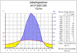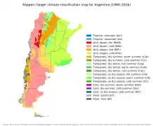 Протяжна територія Аргентини лежить у трьох кліматичних поясах, що змінюють один одного з півночі на південь: тропічному (приблизно до 30 паралелі), субтропічному, помірному (від затоки Сан-Матіас й далі на південь). Середньорічні температури коливаються від +24 °C на півночі до +5 °C на півдні. Клімат країни формується переважно під впливом морських повітряних мас з Атлантичного океану. Проте більше ніж половина території лежить у зоні недостатнього зволоження, що пов'язано з розташуванням гірських систем, які затримують вологі вітри. У Андах — на півночі переважають високогірні, пустельні клімати, в південних районах помірно холодні.