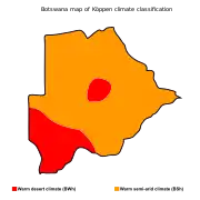 Територія Ботсвани лежить у тропічному кліматичному поясі[6]. Увесь рік панують тропічні повітряні маси[7]. Спекотна посушлива погода з великими добовими амплітудами температури[7]. Переважають східні пасатні вітри. У теплий сезон випадають дощі[7].