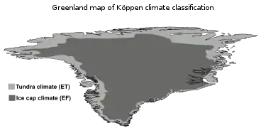 Майже вся територія острова Гренландія лежить у полярному кліматичному поясі, за винятком південного узбережжя, де субполярний клімат переходить у помірний на крайньому півдні[9]. Увесь рік панують полярні повітряні маси. Поверхня скута кригою цілий рік. Відносно м'яка морозна зима, прохолодне літо; на крайній півночі та центральній частині льодовикового куполу суворі морозні зима й літо. Опадів мало[10]. На північному узбережжі впродовж полярної ночі морози досягають −50 °C. Середня температура лютого −29,4 °C. Річна кількість опадів — 200—220 мм. Влітку в прибережних районах погода прохолодна. На західному узбережжі клімат м'якший і тепліший. Середня річна температура вище від 0 °C. Річна кількість опадів коливається від 1000 до 2000 мм. Середня температура січня −7,4°…−10,1 °C. Східне узбережжя знаходиться під впливом холодної Східно-Ґренландської течії. Тут узимку тримається сонячна погода з морозами до −30 °C.