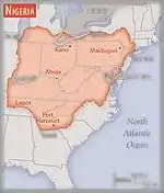Нігерія — західноафриканська країна, що межує з чотирма іншими країнами: на півночі — з Нігером (спільний кордон — 1608 км), на сході — Чадом (85 км) і Камеруном (1975 км), на заході — з Беніном (809 км). Загальна довжина державного кордону — 4477 км[1]. Нігерія на півдні омивається водами Гвінейської затоки Атлантичного океану. Загальна довжина морського узбережжя 853 км.