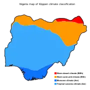 Південь Нігерії лежить у екваторіальному кліматичному поясі, північ — у субекваторіальному[8]. Цілий рік панують екваторіальні повітряні маси[9]. На узбережжі цілий рік спекотно, сезонні коливання температури незначні, значно менші за добові. превалюють слабкі вітри, цілий рік надмірне зволоження, майже щодня по обіді йдуть дощі, часто зливи з грозами[9]. На півночі влітку переважають екваторіальні повітряні маси, взимку — тропічні. Влітку вітри дмуть від, а взимку до екватора. Сезонні амплітуди температури повітря незначні, зимовий період не набагато прохолодніший за літній. Зволоження нестійке, влітку можуть відбуватись посухи[9].