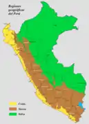 У фізико-географічному відношенні територію Перу можна розділити на 3 велких райони, що відрізняються один від одного рельєфом, кліматом, рослинним покривом:
