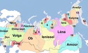 - Північний Льодовитий океан — Баренцове, Біле, Карське, Лаптєвих, Східносибірське і Чукотське моря на півночі[7].